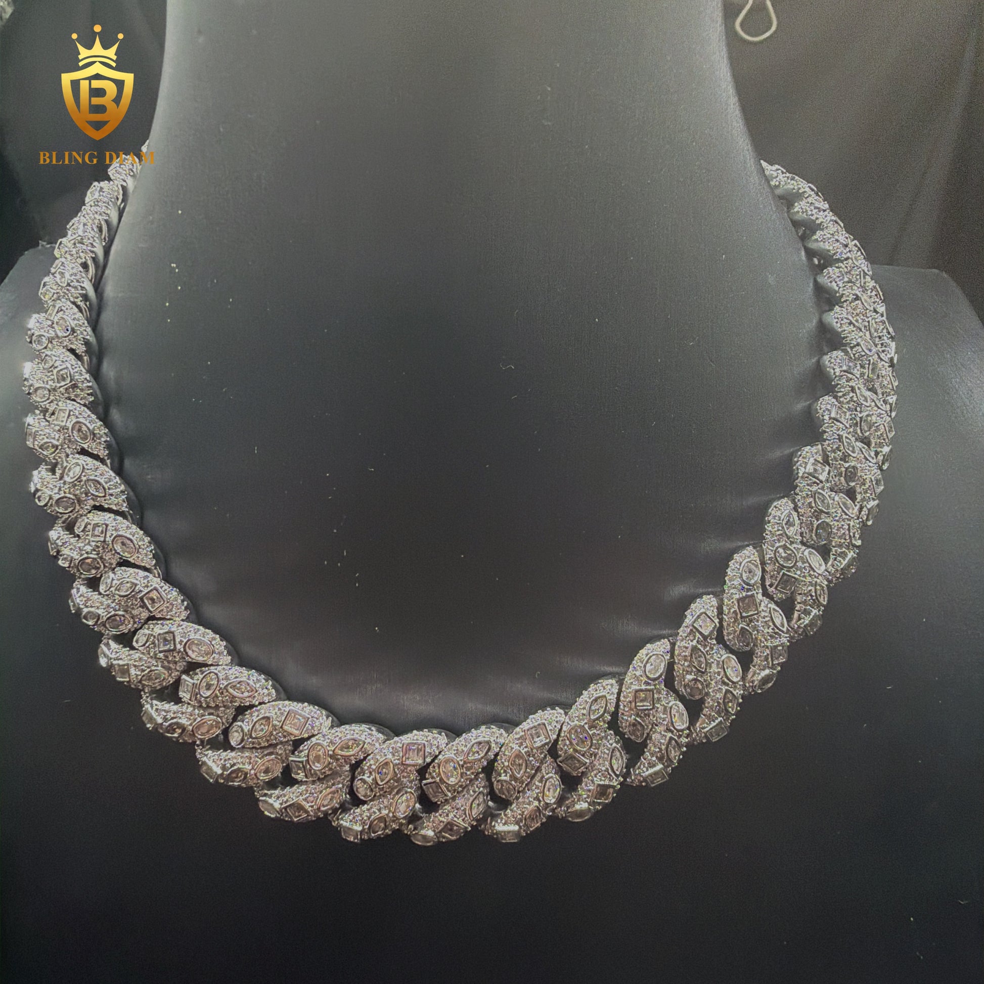 This 15mm custom Cuban link chain is designed for clean hip-hop style with a premium, ice-white finish. Crafted from solid 925 sterling silver and finished with rhodium plating, it offers enhanced shine, durability, and resistance to tarnish. Fully iced out with VVS moissanite stones, the chain delivers diamond-level brilliance with strong fire and clarity.