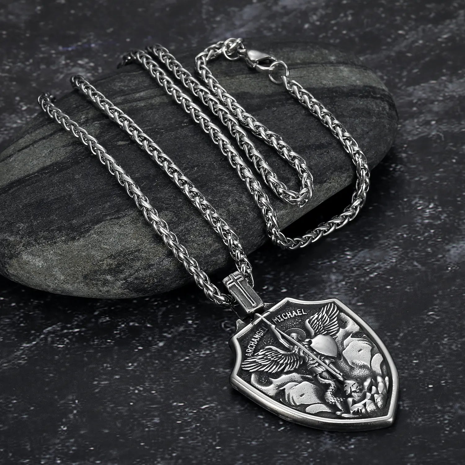 The pendant showcases a detailed relief of St. Michael the Archangel wielding his sword against a demonic figure, symbolizing the victory of good over evil. The shield shape itself is a traditional symbol of defense. A small cross adorns the top of the shield, further emphasizing its religious significance. This pendant comes with a sturdy stainless steel chain, making it a meaningful and inspirational piece for daily wear.