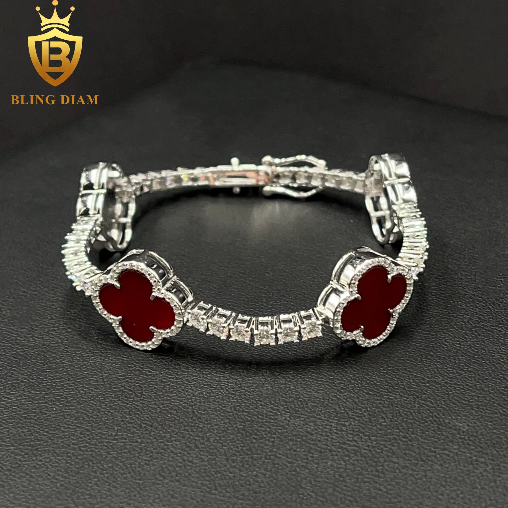 The Moissanite Clover Necklace is a striking combination of luck and style, blending the sparkle of moissanite with the classic symbol of the four-leaf clover. Detailed red and black designs add a bold touch to the stylish look.