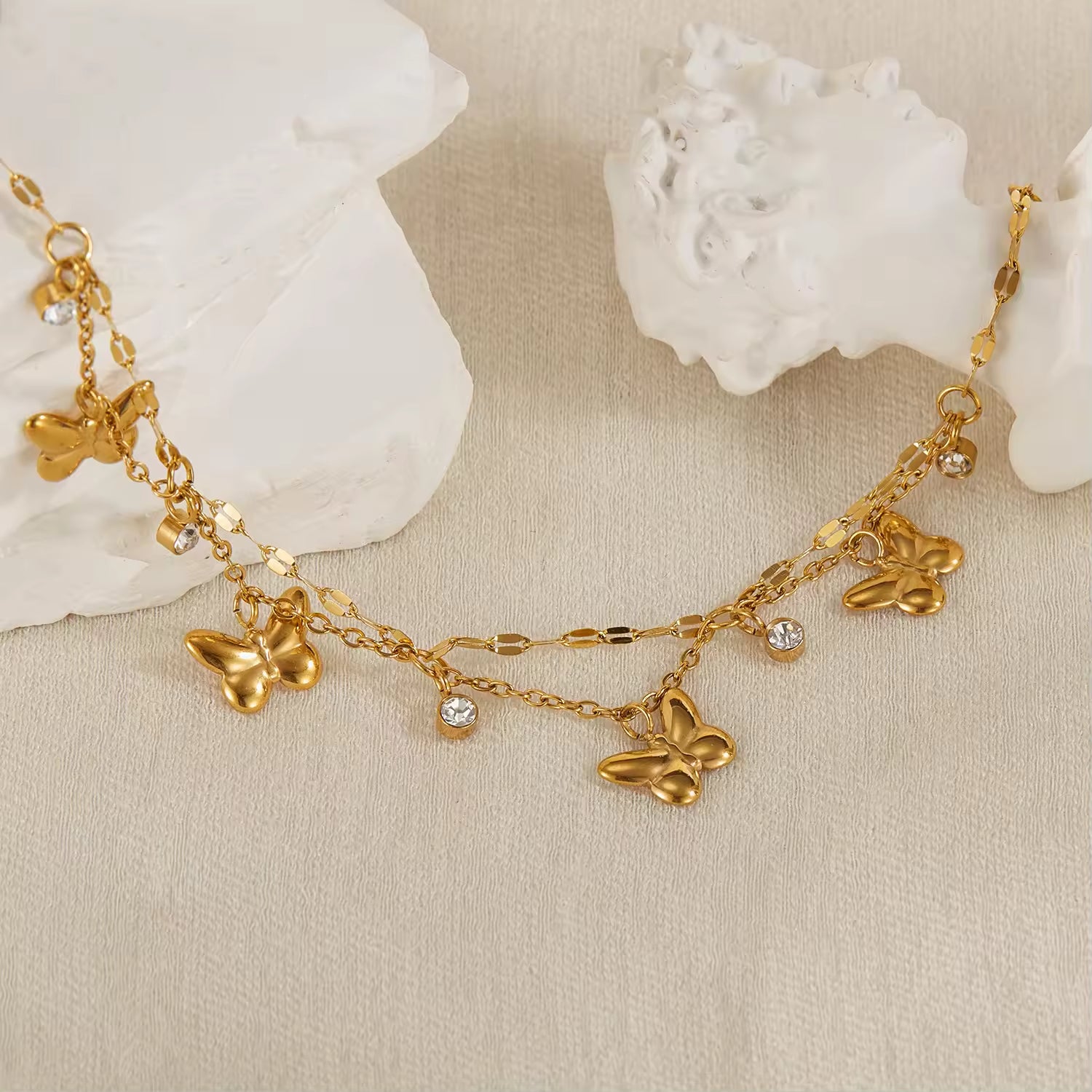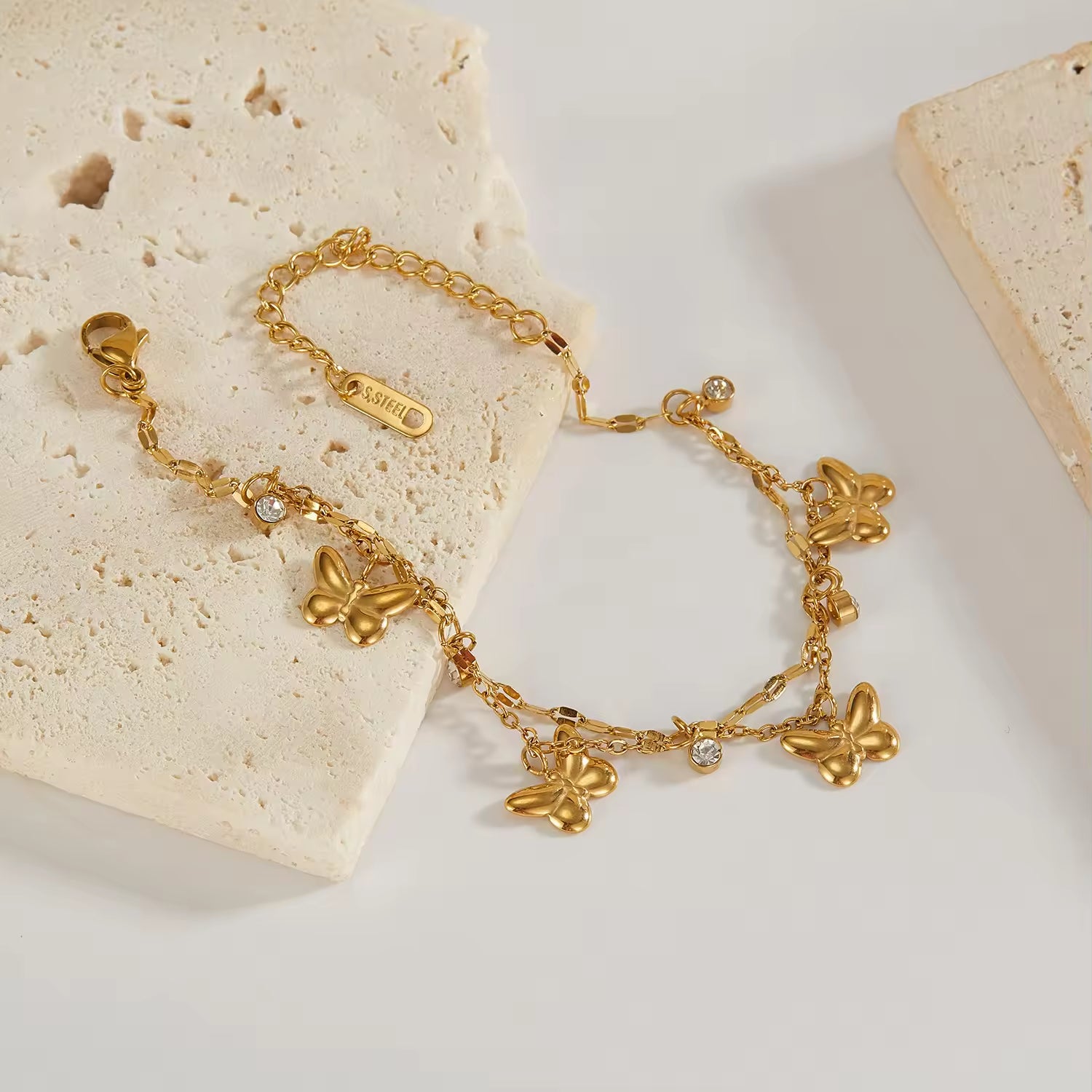 Elevate your everyday style with this Double-Layer Butterfly Charm Bracelet, crafted from high-quality stainless steel and plated in luxurious 18K gold. Featuring a delicate butterfly pendant and sparkling circle zircon charm, this bracelet combines elegance with modern design. Its double-chain structure adds depth and sophistication, while the waterproof and tarnish-resistant finish ensures long-lasting brilliance.