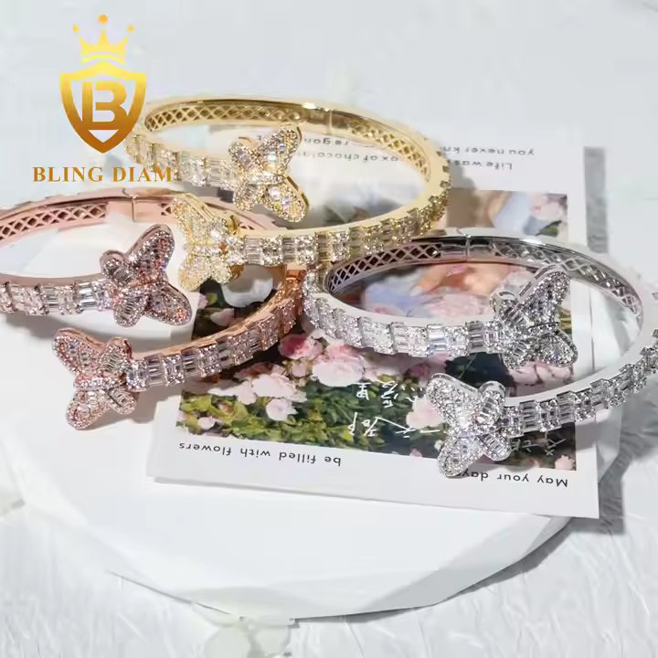 This bangle beautifully combines delicate butterfly motifs with the strong Cuban link design. Each butterfly is set with sparkling moissanite stones, carefully placed along a sterling silver Cuban link band. The result is a unique piece that blends strength with charming style.