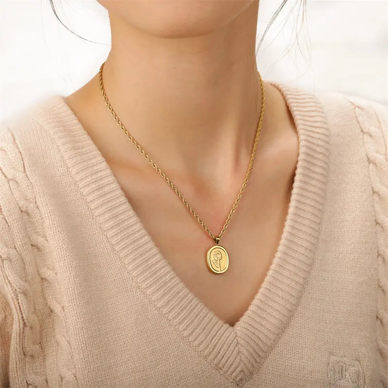 Bright and meaningful, this oval pendant necklace features a delicately engraved sunflower — a classic symbol of hope and positivity. Crafted from high-quality stainless steel with a shiny 18K gold-plated finish, it's a beautiful everyday piece designed to last.