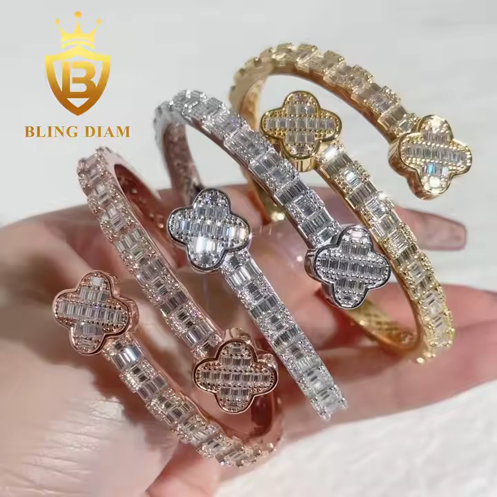 This striking bangle features a series of carefully crafted four-leaf clover motifs, each set with high-quality moissanite stones. The design, made in 925 sterling silver, offers a continuous pattern of symbolic style. The rigid structure of the bangle enhances its bold presence, allowing each stone to shine brightly.