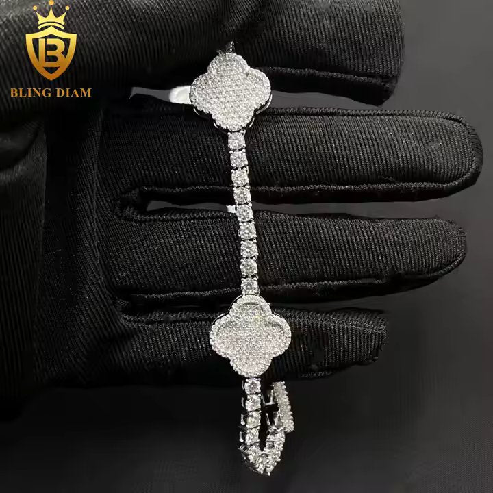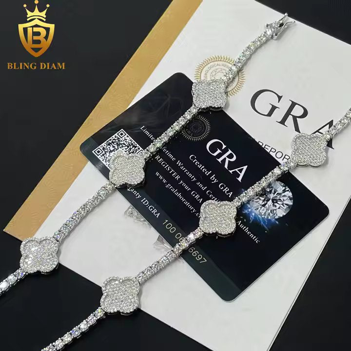 This exquisite necklace showcases a charming series of four-leaf clover motifs, each embedded with sparkling VVS moissanite stones to catch the eye with every movement. Crafted meticulously in 925 sterling silver, the design offers both a sense of elegance and the timeless allure of good fortune.