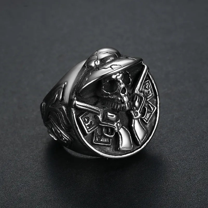 Show off your daring style with this eye-catching Skull Pistols Band, designed for today's trendsetters. Made from durable 316L stainless steel, it combines a tough yet polished look with gold and silver plating. This ring showcases an intriguing design of skulls alongside crossed pistols, representing boldness and strength.