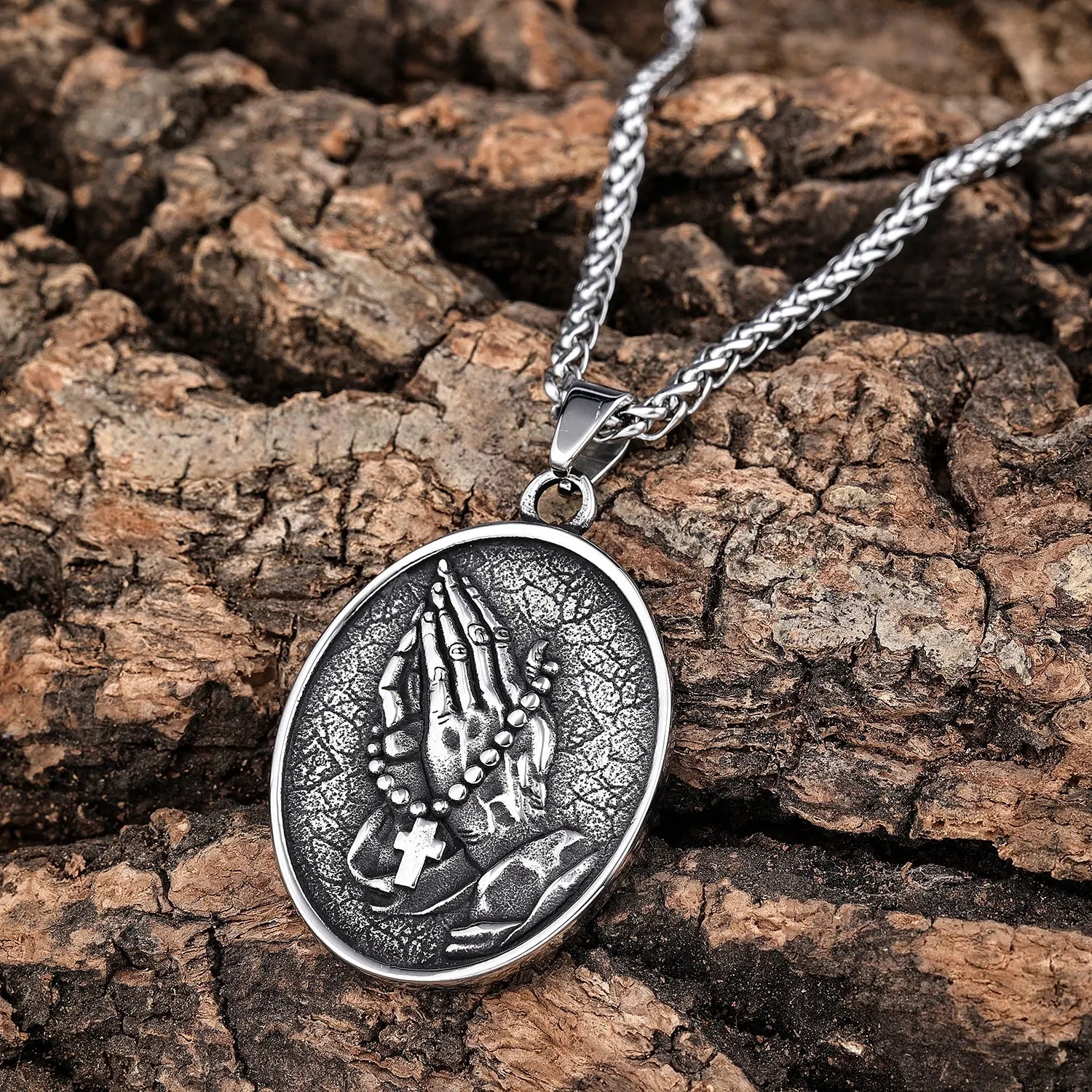 Keep faith close with this deeply symbolic Praying Hands Pendant necklace. Crafted from durable stainless steel with a detailed antique finish, this powerful medallion depicts clasped hands in prayer, draped with a traditional rosary featuring a delicate cross accent, all rendered in beautiful relief.