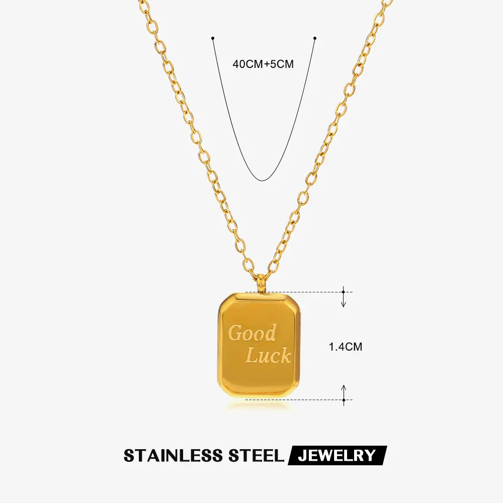 A little luck goes a long way. This sleek pendant is engraved with Good Luck in a soft serif font, giving timeless charm with a whisper of meaning. Its smooth, weighty form feels grounding on the neck — the kind of everyday piece that quietly carries intention.