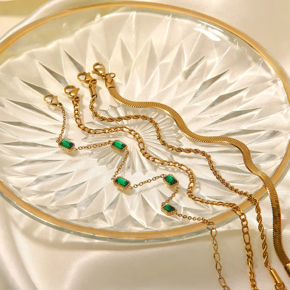 Fall in love with elevated elegance through this Green Heart Zircon Bracelet, crafted from premium stainless steel and finished with a rich layer of 18K gold plating for a lasting, luxurious shine. The bracelet features a sparkling green cubic zircon heart, paired with a refined mix of Figaro and snake chain textures, creating a unique layered effect that stands out with feminine charm.