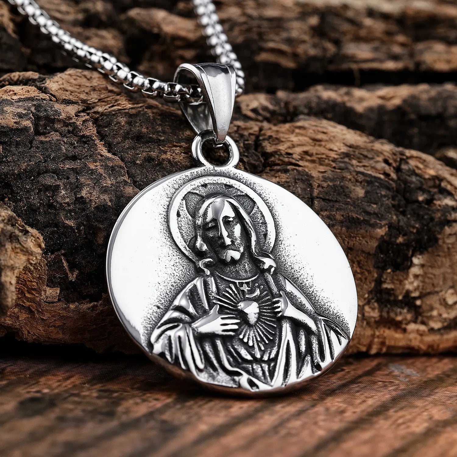 Carry a symbol of faith and divine love with this Sacred Heart Medallion necklace. Crafted from durable stainless steel with a classic antique finish, this round pendant features a beautifully detailed relief portrait of Jesus Christ revealing the Sacred Heart, an emblem of compassion and devotion.