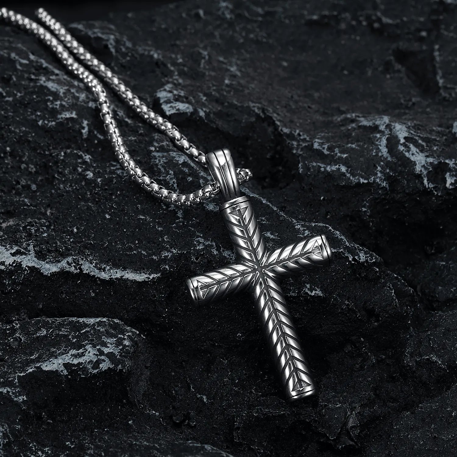 The pendant features a classic Latin cross shape adorned with detailed, vein-like patterns that resemble leaves, giving it an organic and elegant aesthetic. The high-polished silver finish enhances the intricate design. This pendant comes with a sturdy stainless steel chain, making it a beautiful and personal expression of religious belief.
