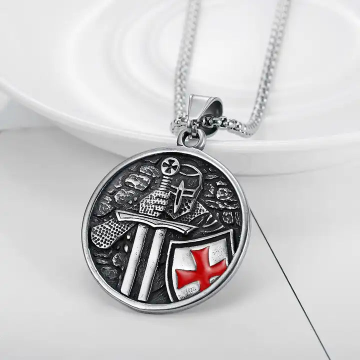 Channel the unwavering spirit of the Crusades with this Templar Knight Pendant — a bold tribute to valor, honor, and faith. Cast in premium stainless steel, this vintage-style medallion features a detailed knight’s helmet, broad sword, and a battle-worn shield adorned with a vivid red cross.