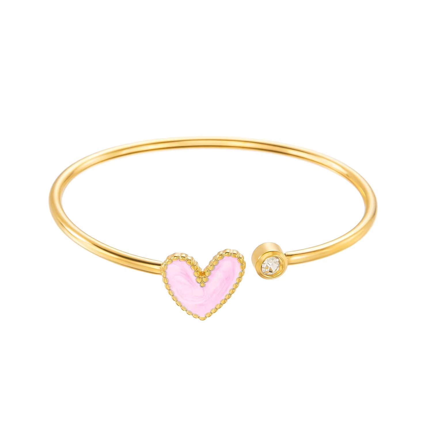 Add a touch of sparkle and charm with this Enamel Heart Cuff Bangle, crafted from high-quality stainless steel and plated in luxurious 18K gold. Featuring a vibrant enamel heart design accented with brilliant zircon crystals, this bracelet perfectly blends modern fashion with feminine elegance. Waterproof and tarnish-resistant, it’s designed to keep its shine and beauty through everyday wear.