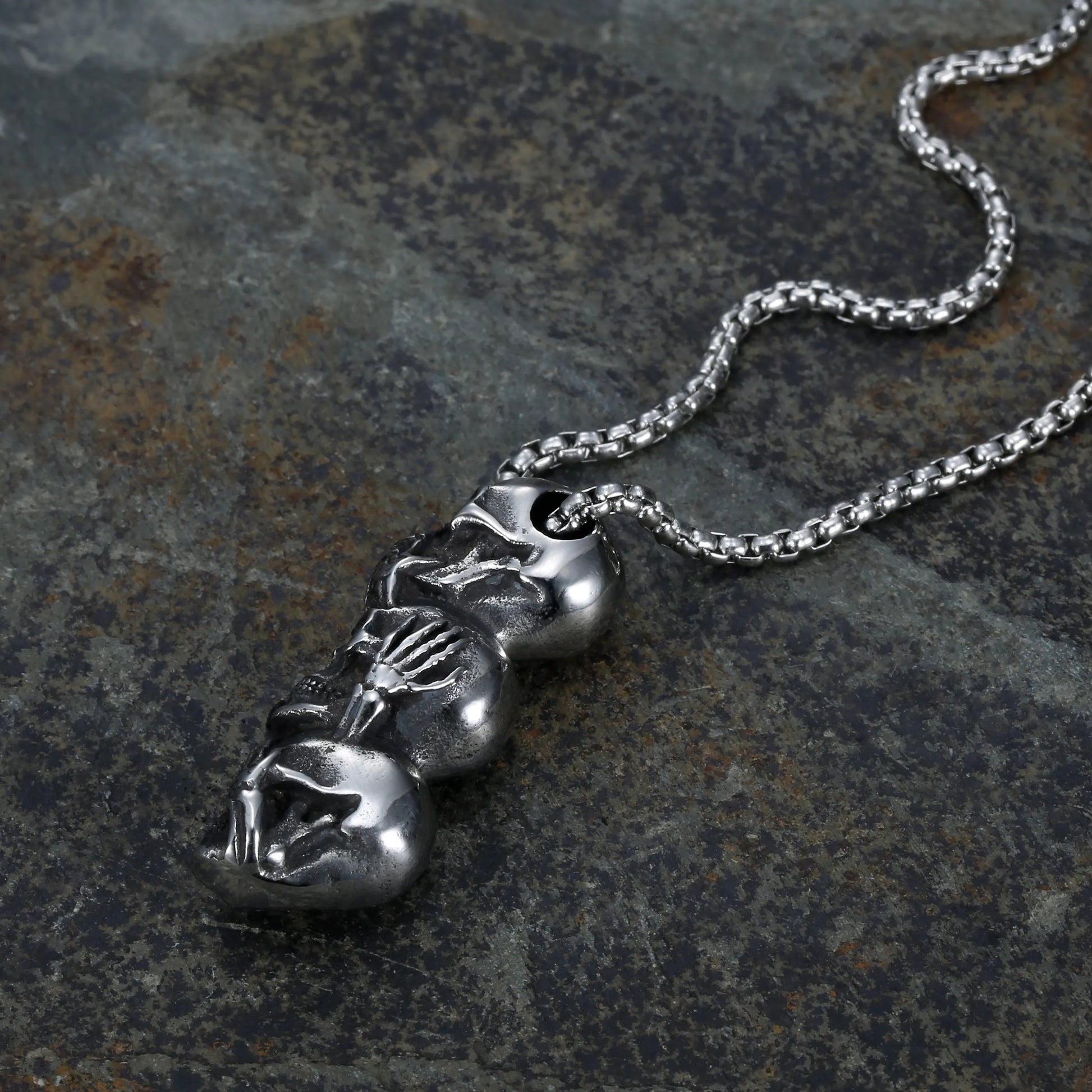 Embrace a bold and symbolic style with this vintage punk-inspired necklace. Crafted from stainless steel with a silver finish, this long pendant features three skulls stacked vertically, each depicting one of the iconic "see no evil, hear no evil, speak no evil" gestures. Perfect for men who appreciate gothic and biker aesthetics, this necklace is a statement piece that exudes rebellious individuality and thought-provoking symbolism.