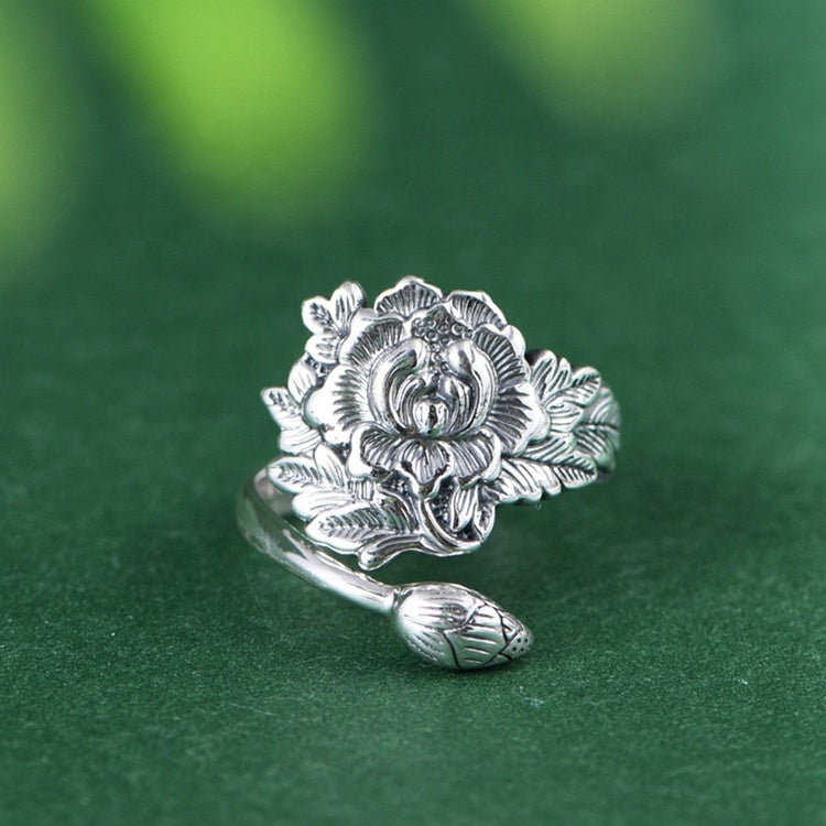 Elevate your look with the Real S999 Sterling Silver Wide Peony Flower Ring, a perfect blend of artistry and elegance. Featuring a bold wide-band design with intricate peony carvings, this piece reflects traditional Chinese symbolism of prosperity, beauty, and honor. Crafted from high-purity S999 sterling silver, it offers exceptional shine, durability, and a premium feel. Its adjustable open design ensures a comfortable fit, making it both fashionable and versatile for everyday wear or special occasions.