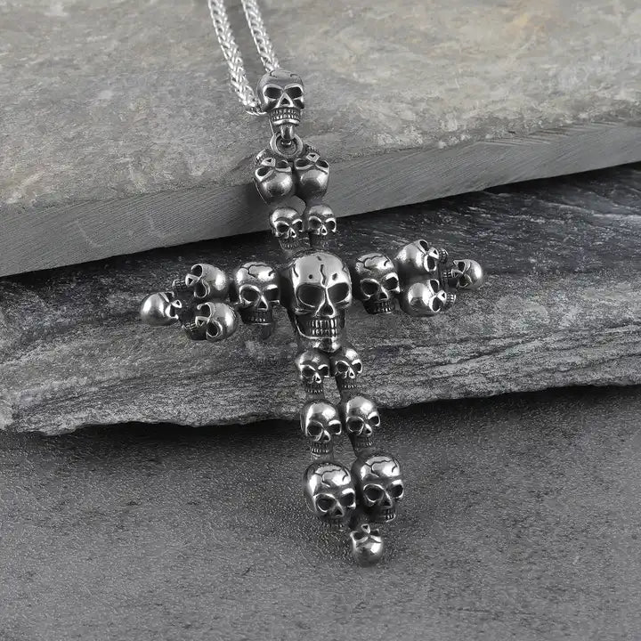 Not your average crucifix — the Skull Legion Cross Pendant is forged for the bold, the fearless, and the ones who don’t follow the rules. This cross is built entirely from stacked skulls, each one a silent nod to the battles you've faced and the fire you carry.