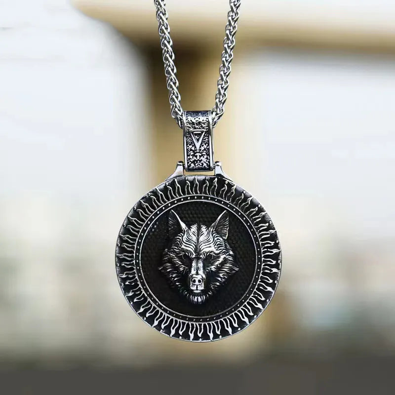 Lead the pack with primal pride. This bold circular pendant features a snarling wolf head set against a textured black backdrop and framed by flame-like etching. Inspired by Norse power and tribal strength, it’s the kind of piece that speaks without barking — made for those who command without asking.
