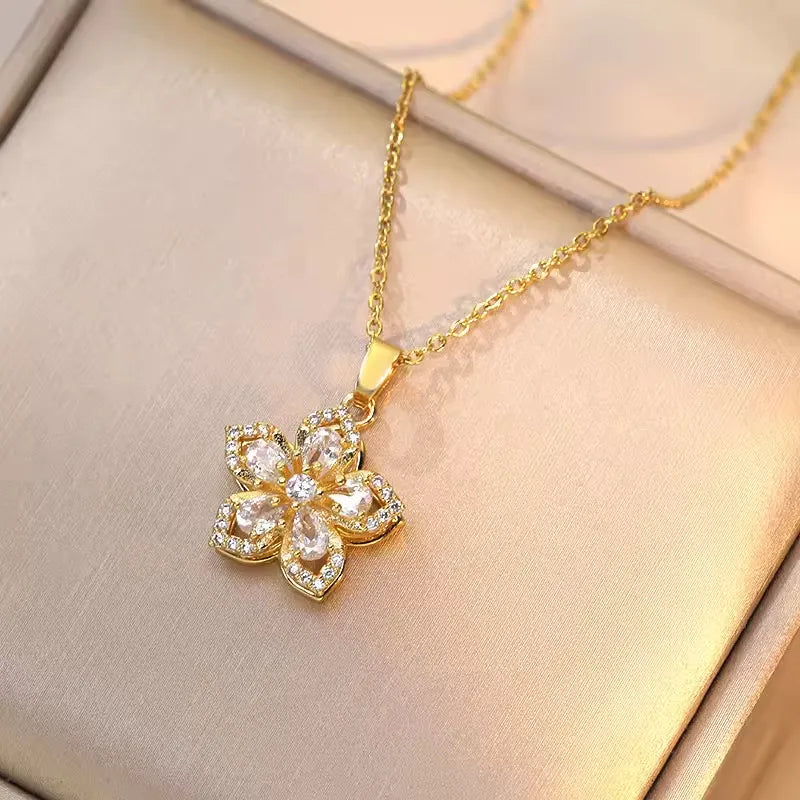 A garden of motion, cast in gold. These radiant floral pendants are designed to gently spin as you move — catching the light from every angle. With jewel-toned petals, crystal trim, and a mesmerizing twist, each necklace brings your look to life.
