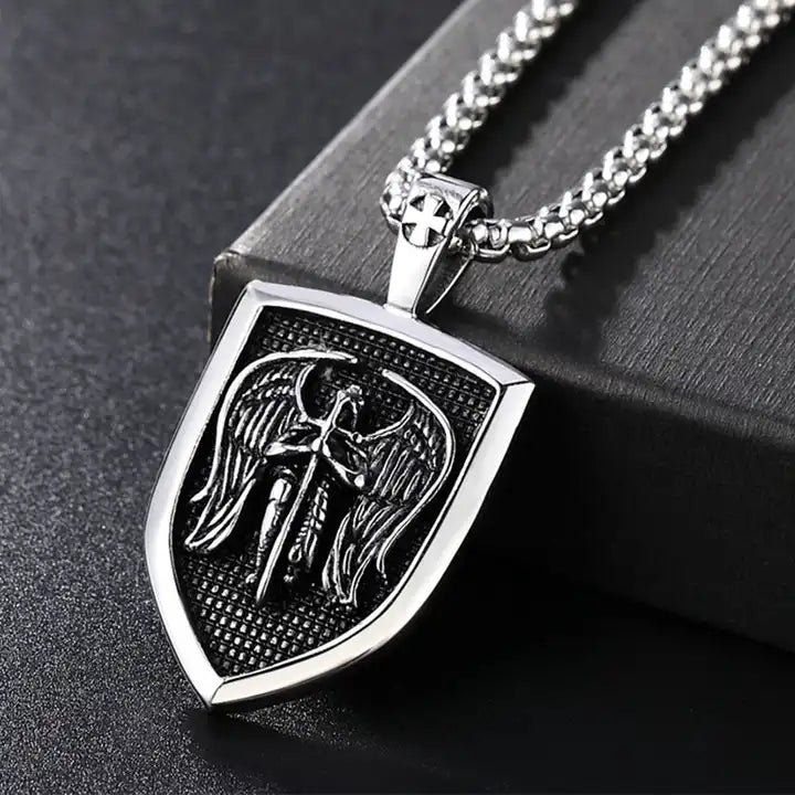 Embrace the strength and protection of divine intervention with this exquisite pendant. Featuring the powerful symbolism of an archangel's wings and shield, it serves as a constant reminder of faith's unyielding strength and celestial guardianship.