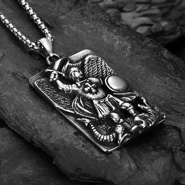 Stand firm with the Archangel at your side. This bold pendant depicts Saint Michael in full battle stance, slaying the serpent — a timeless symbol of divine justice, courage, and spiritual protection. Designed for warriors of faith, fighters of darkness, and those who carry conviction like armor.