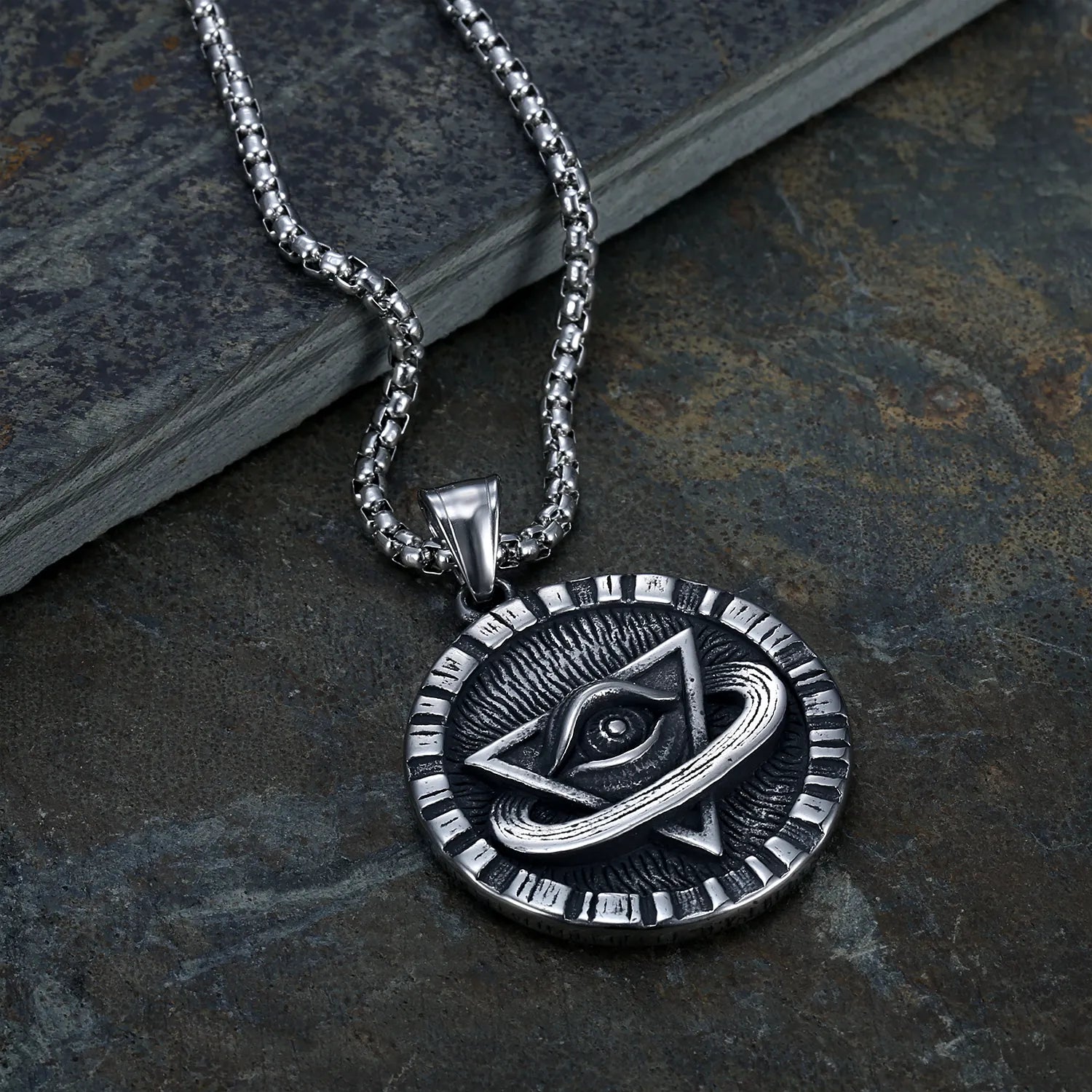 Channel the cosmic allure with the Mystic Eye Triangle Pendant, a piece that uniquely fuses vision with protection. This pendant's intricate eye and triangle design symbolizes the universe's watchful presence, crafted meticulously in premium stainless steel.