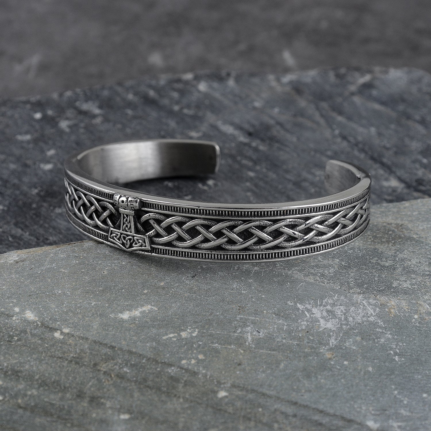 Channel the power of Mjölnir, the hammer of Thor, with this Stainless Steel Viking Bracelet, crafted to embody strength, courage, and protection. Featuring detailed Valknut engravings, Celtic knot patterns, and Viking runes, this bracelet blends ancient Nordic symbolism with modern masculine style. Its rugged stainless steel construction and open cuff design offer durability, comfort, and an adjustable fit.