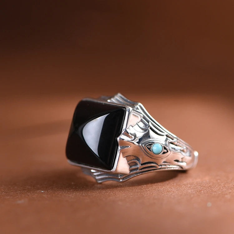 Bold in design and rich in symbolism, this retro punk-style ring combines the grounded power of black agate with the raw confidence of sterling silver—crafted for those who carry strength in silence.